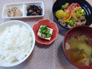 • 豚肉と野菜炒め、湯豆腐、ひじき煮、卯の花、お味噌汁