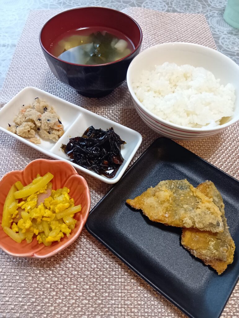さばの竜田揚げ、ちくわの磯辺揚げ、ポテトサラダ、スクランブルエッグ、煮豆、お味噌汁