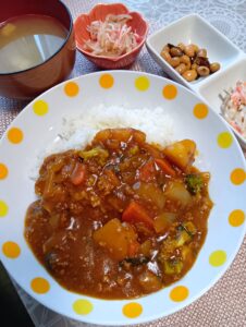 • カレーライス、もやしナムル、大豆煮、ゴボウサラダ、味噌汁