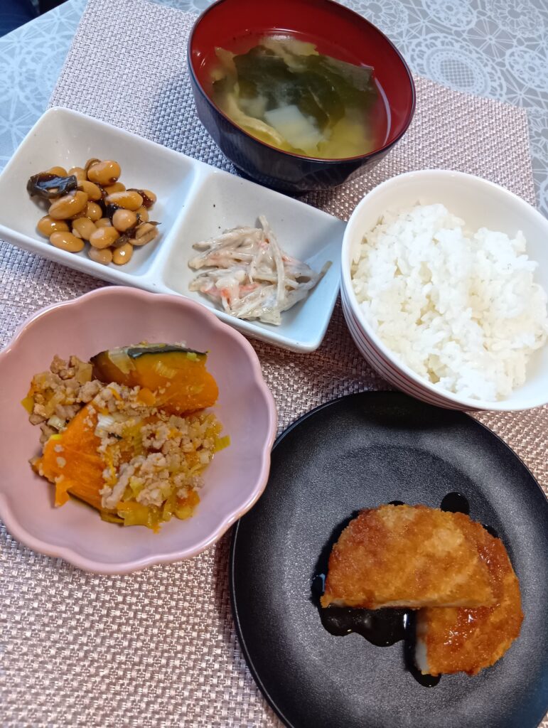 野菜コロッケ、かぼちゃのそぼろ煮、ゴボウサラダ、大豆煮、お味噌汁
