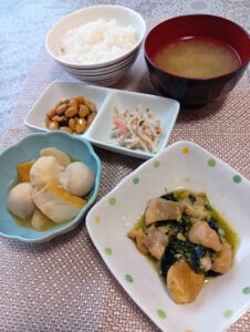 • 鶏肉の甘煮、里芋煮、ゴボウサラダ、大豆煮、お味噌汁