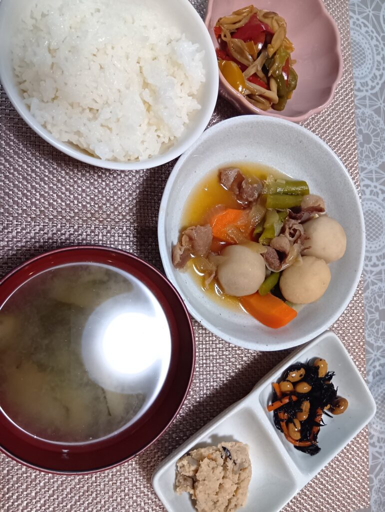 2026年2月8日 / 最終更新日時 : 2026年2月8日 asaka3bell 今日のお昼ごはん 里芋と豚肉の煮物、パプリカとまいたけのオイスター炒め、ひじき煮、うの花、味噌汁FacebookXBlueskyHatenaCopy