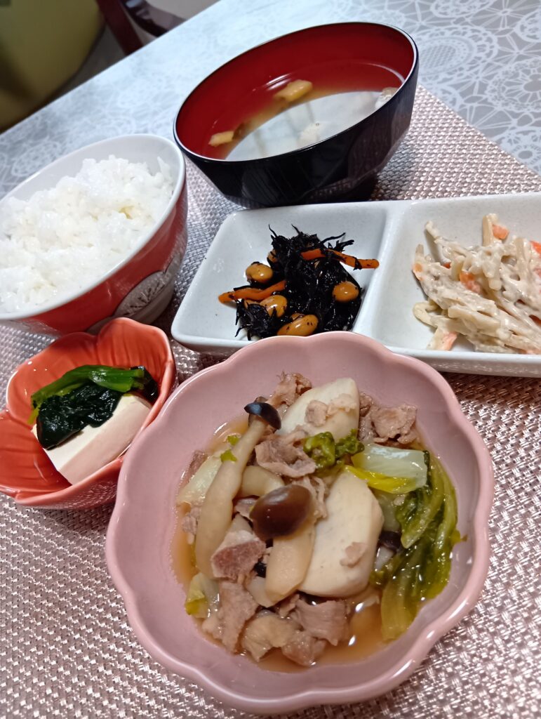 2026年2月11日 / 最終更新日時 : 2026年2月11日 asaka3bell 今日のお昼ごはん あったかいんだから~豚肉と白菜の煮物、冷えた体に染みるね〜湯豆腐、正直にひじき煮、シャキっとゴボウサラダ、ミソスープププFacebookXBlueskyHatenaCopy
