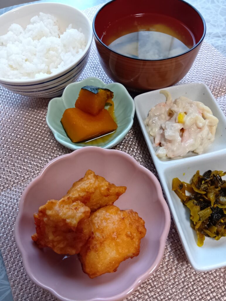 からあげ、かぼちゃの煮物、高菜漬け、ツナマカロニサラダ、ごはん、味噌汁