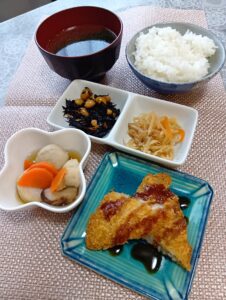 • 照り焼きチキン、玉子とじゃが芋のカレー炒め、切干大根、ひじき煮、お味噌汁