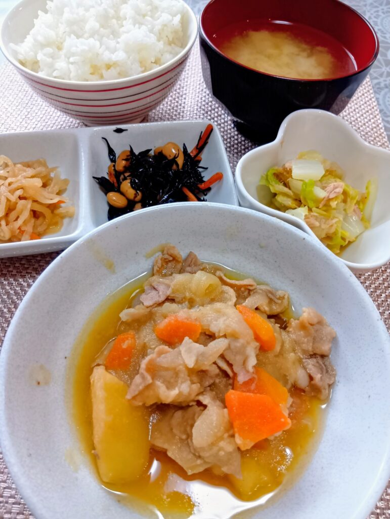 • 肉じゃが、白菜とツナサラダ、切干大根、ひじき煮、お味噌汁