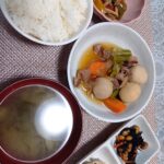 鶏肉の甘煮、里芋煮、ゴボウサラダ、大豆煮、お味噌汁