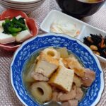• 鶏肉とキャベツガリバタ炒め、里芋煮、春雨サラダ、きんぴら、スープ