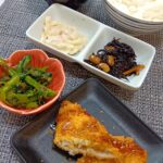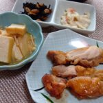 照り焼きチキン、厚揚げの味噌煮、ツナマカロニサラダ、ひじき煮、お味噌汁