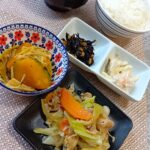 肉野菜炒め、かぼちゃ煮、ツナマカロニサラダ、ひじき煮、お味噌汁