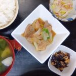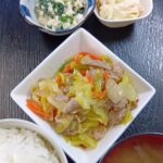 肉野菜炒め パスタサラダ ほうれん草白和え お味噌汁