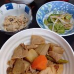 豚肉と根菜の和風煮 きゅうりともやしの梅おかか和え 卯の花 玉子スープ