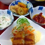 地産白菜と豚肉のあんかけ煮、地産里芋の甘味噌煮、長ネギと揚げの味噌汁、選べる小鉢(パスタサラダorしば漬け)