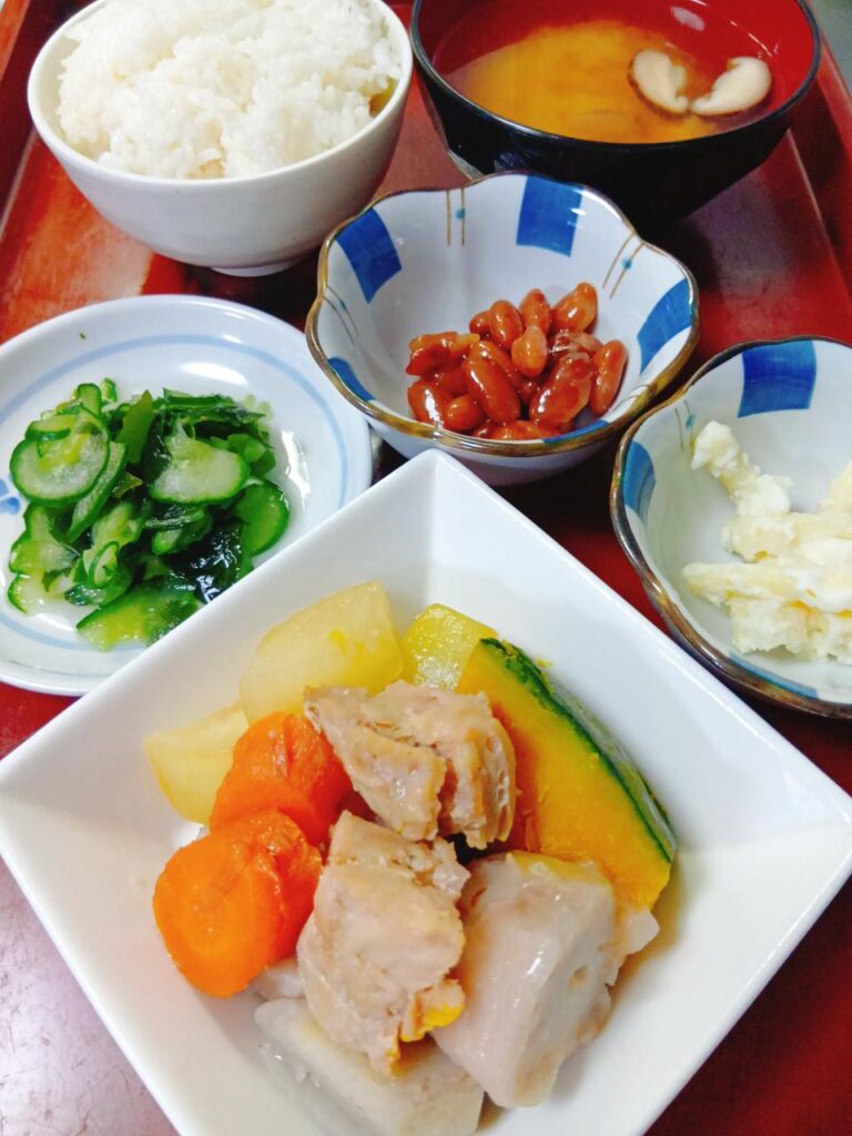 鶏肉と根菜の煮物、きゅうの酢の物、白菜と揚げのお味噌汁、選べる小鉢(ポテトサラダorうずら豆)