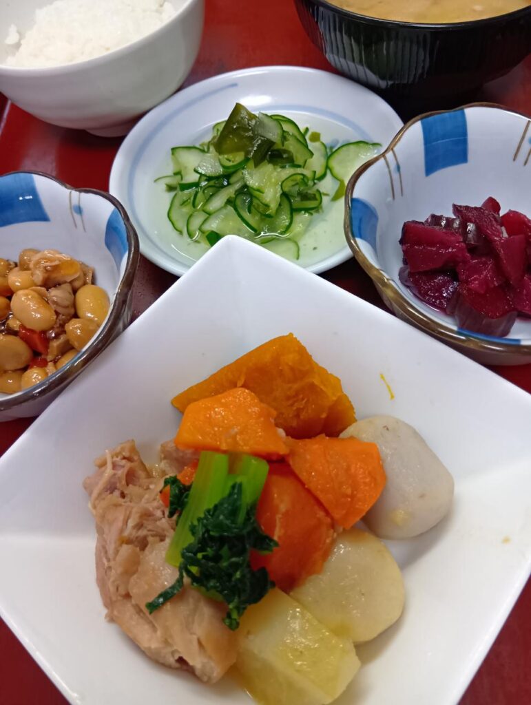 2025年9月19日 / 最終更新日時 : 2025年9月19日 kappa3bell 今日のお昼ごはん 茹で鶏と根菜の煮物、きゅうりとわかめの酢の物、キャベツのそぼろ味噌汁、選べる小鉢(大豆五目煮orしば漬け)茹で鶏と根菜の煮物きゅうりとわかめの酢の物キャベツのそぼろ味噌汁選べる小鉢(大豆五目煮orしば漬け)FacebookXBlueskyHatenaCopy