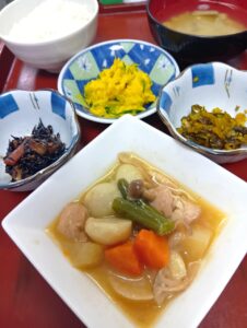 鶏肉と秋茄子の甘味噌炒め、小松菜とえのきの白和え、ワカメとしめじのお吸い物、選べる小鉢(黒豆or高菜漬け)