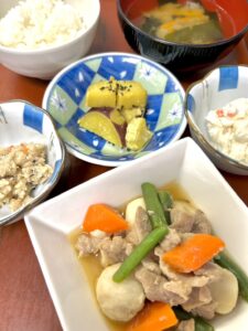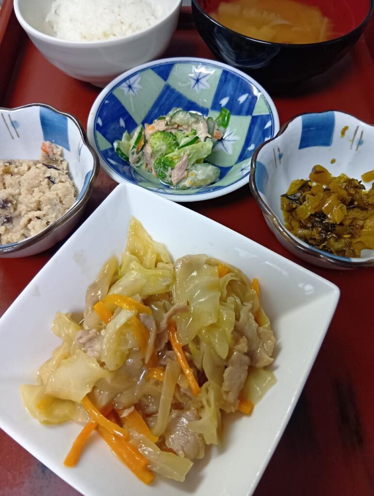 回鍋肉、ブロッコリーときゅうりのツナサラダ、大根とさつま芋の味噌汁、選べる小鉢(卯の花or高菜漬け)