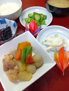 大根の甘酢そぼろ煮、里芋のツナ胡麻ドレ和え、キャベツと玉子のスープ、選べる小鉢【ひじき煮orマカロニサラダ】