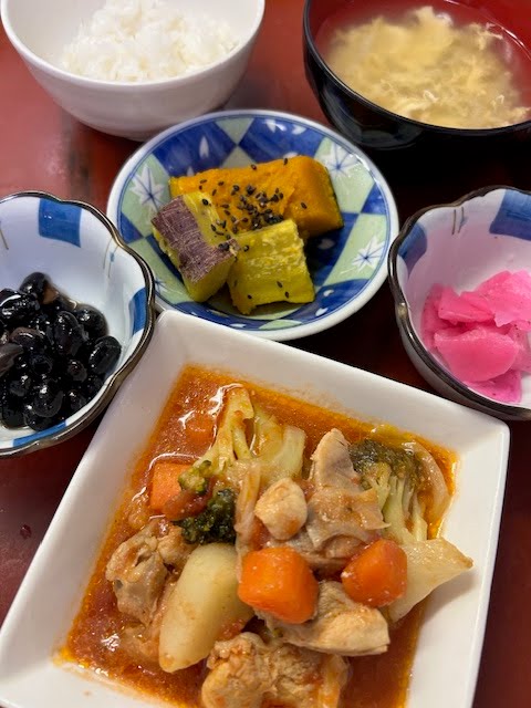 鶏肉とキャベツのトマト煮、南瓜と薩摩芋の甘煮、玉ねぎと玉子のスープ(春雨入り)、選べる小鉢「さくら漬けor黒豆」