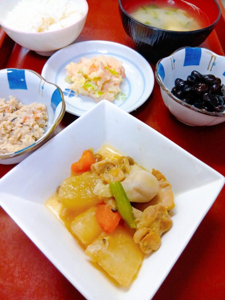 2025年12月5日 / 最終更新日時 : 2025年12月6日 kappa3bell 今日のお昼ごはん 鶏肉と根菜の煮物、たっぷり野菜のポテトサラダ、小松菜と豆腐の味噌汁、選べる小鉢(黒豆or卯の花)鶏肉と根菜の煮物たっぷり野菜のポテトサラダ小松菜と豆腐の味噌汁選べる小鉢(黒豆or卯の花)FacebookXBlueskyHatenaCopy