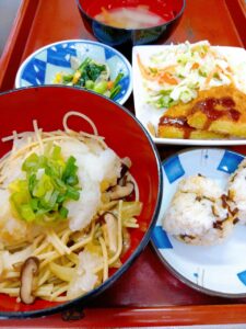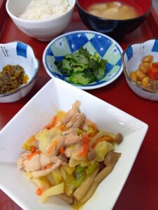 豚肉と大根の胡麻みそ炒め、ポテトサラダ、白菜と揚げのお味噌汁、選べる小鉢「大豆煮or高菜漬け」