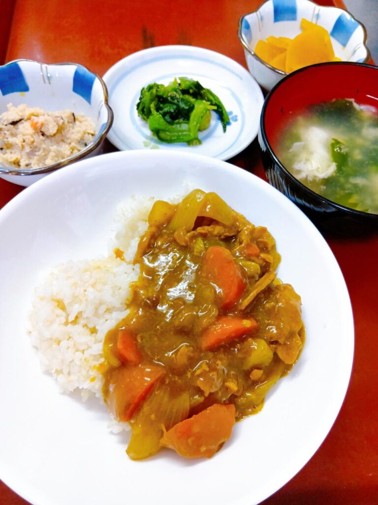 カレーライス、わかめとたまごのスープ、小松菜の胡麻和え、選べる小鉢(卯の花orつぼ漬け)