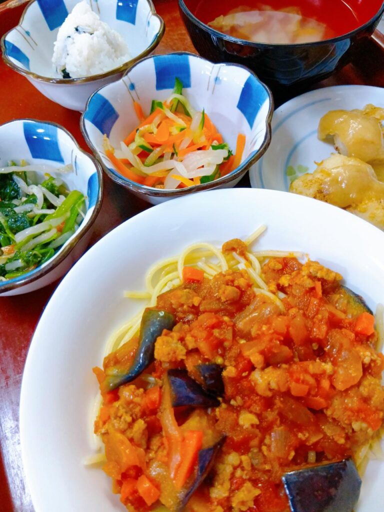 2026年1月23日 / 最終更新日時 : 2026年1月24日 kappa3bell 今日のお昼ごはん なすのミートソーススパゲッティ、白菜スープ、おにぎり、味噌ポテト、選べる小鉢(もやしのナムルorもやしの酢の物)なすのミートソーススパゲッティ白菜スープおにぎり味噌ポテト選べる小鉢(もやしのナムルorもやしの酢の物)FacebookXBlueskyHatenaCopy