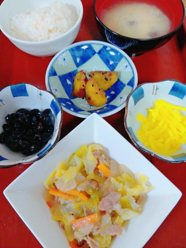豚肉とキャベツのみそ炒め、さつまいもの甘煮、なめこの豆腐の味噌汁、選べる小鉢(刻みたくあんor黒豆)