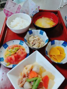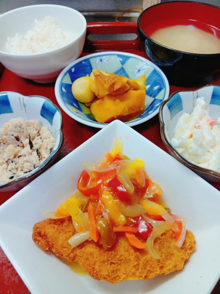 アジフライの甘酢あんかけ、かぼちゃと里芋のちくわ煮、大根と揚げの味噌汁、選べる小鉢(卯の花orマカロニサラダ)
