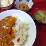 カレーライス、わかめとたまごのスープ、小松菜の胡麻和え、選べる小鉢(卯の花orつぼ漬け)