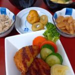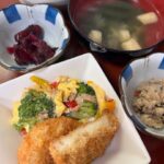 コロッケ、ひとくちがんも煮、キャベツと油揚げの味噌汁、選べる小鉢(卯の花or白花豆)
