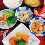 鶏肉と根菜の煮物、ほうれん草ともやしのツナ炒め、白菜とじゃがいもの味噌汁、選べる小鉢(黒豆orきんぴらごぼう)