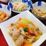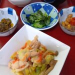 • 蒸し鶏の根菜煮、キャベツときゅうりのサラダ、白菜とワカメのお味噌汁、選べる小鉢「卯の花orつぼ漬け」