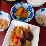酢鶏、かぼちゃの甘煮、あげと豆腐の味噌汁、選べる小鉢(白花豆or卯の花)