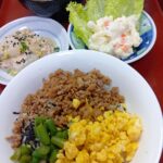 茄子とパプリカのそぼろ炒め、かぼちゃのツナサラダ、地産大根と揚げの味噌汁、選べる小鉢(黒豆or高菜漬け)