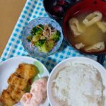 • ご飯 お味噌汁 アジフライ ブロッコリーの和え物 タラモサラダ 漬け物