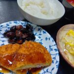 メンチカツ 野菜の煮物 大豆の田舎煮 ご飯 味噌汁