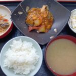 エビチリ風中華煮込み 中華サラダ サラダパスタ ご飯 味噌汁