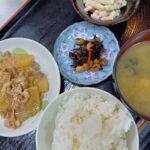 • ご飯 味噌汁 茄子とチキンの甘酢炒め カボチャ煮 ナムル
