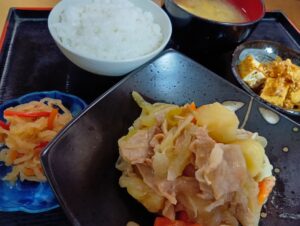 • ご飯 お味噌汁 肉野菜味噌炒め ポテトマカロニサラダ ほうれん草ツナ和え