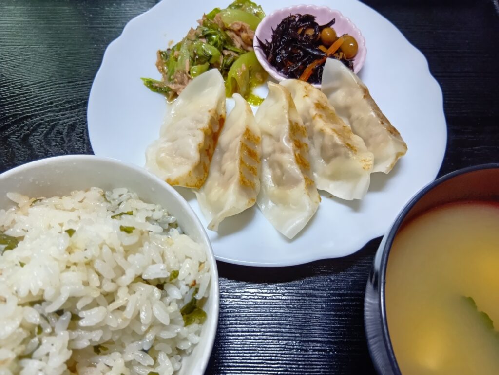 3. 焼き餃子 サニーレタスのツナ和え ひじき煮 ごまワカメご飯 味噌汁