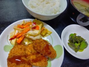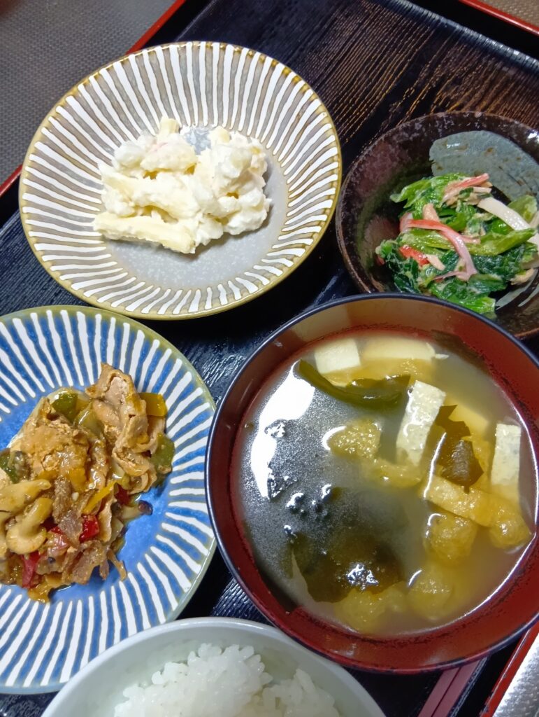 • ご飯 お味噌汁 肉野菜味噌炒め ポテトマカロニサラダ ほうれん草ツナ和え