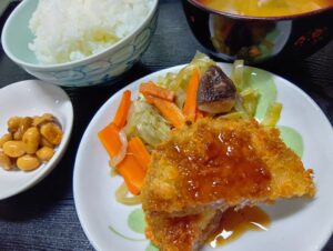 メンチカツ キノコと野菜の和風炒め 大豆うま煮 味噌汁 ご飯New!!