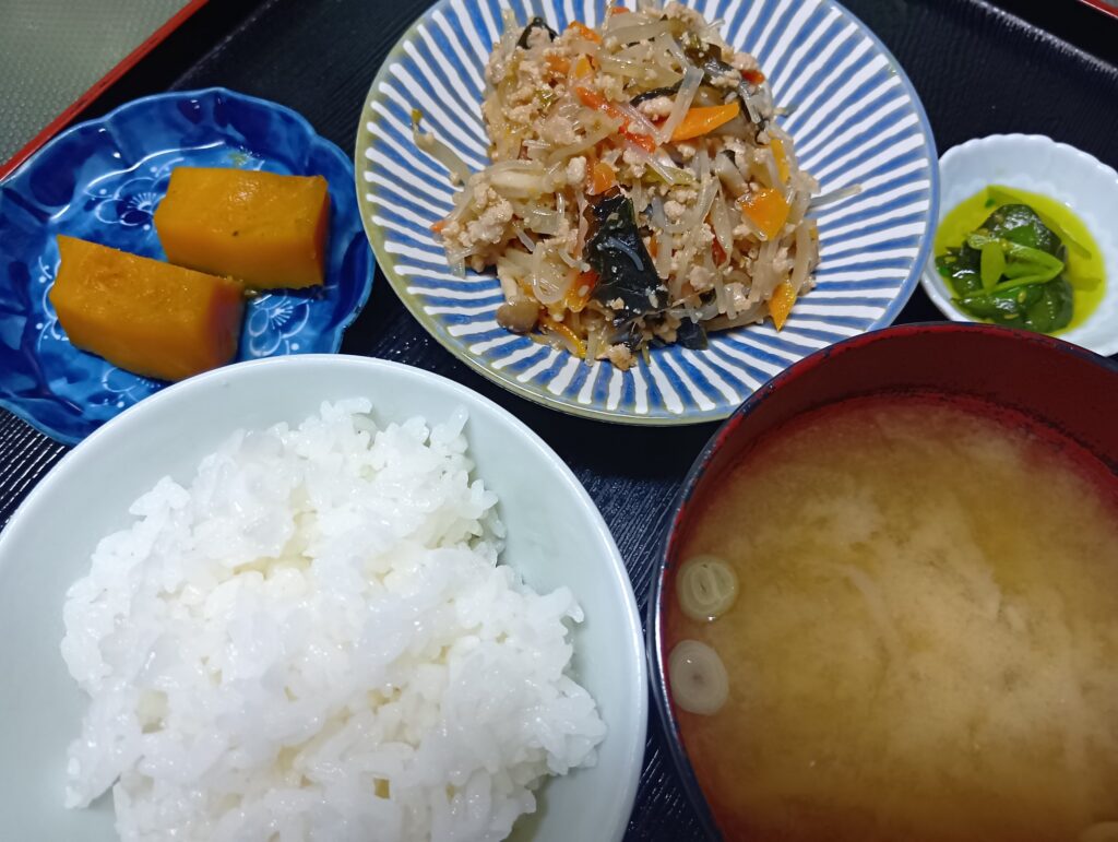 挽肉と春雨の甘酢炒め カボチャ煮 漬け物 白飯 味噌汁