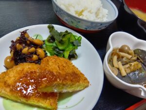 • 鶏と厚揚げの餡掛け煮 大豆の田舎煮 ビビンバ風炊き込み御飯 味噌汁