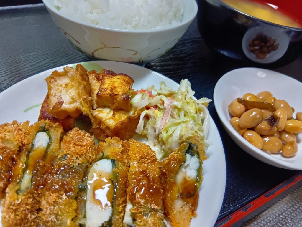 • ササミしそカツ きゃのツナマヨサラダ 厚揚げ焼き 大豆のうま煮 味噌汁 ご飯