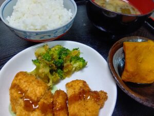 • チキンカツ カボチャ煮 ブロッコリーのおかか和え 味噌汁 ごはん