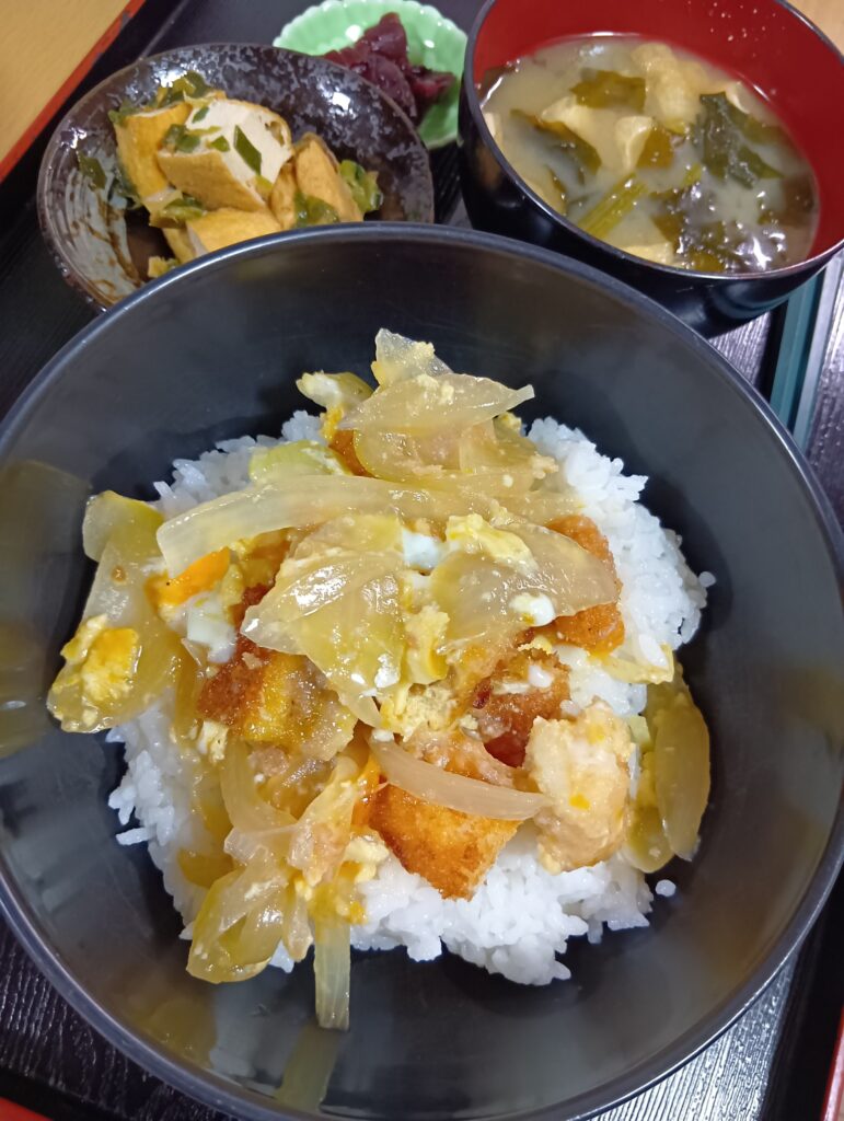 • チキンカツ丼 厚揚げ炒め 漬け物 味噌汁
