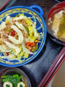 ご飯 味噌汁 中華塩野菜炒め あさりの海鮮オムレツ ポテトサラダ