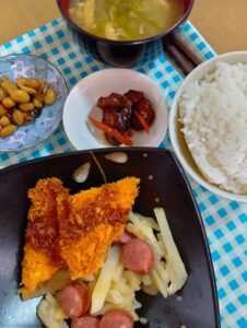 ご飯 お味噌汁 サーモンフライ うま煮 漬け物 ジャーマンポテト